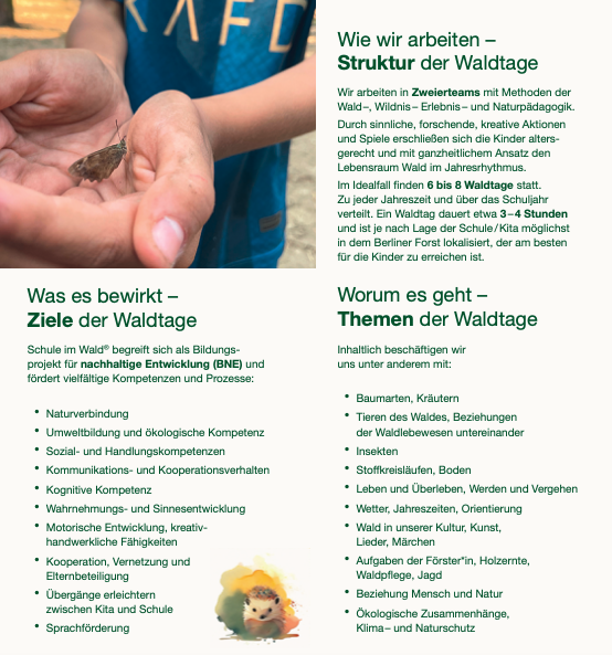 In der Berliner waldpädagogischen Projektlandschaft ist Schule im Wald® konzeptionell einzigartig. Das Projekt unterscheidet sich von anderen Angeboten durch die Kontinuität, mit der die beteiligten Gruppen, begleitet von ihrem Schule im Wald® -Team, alle Jahreszeiten und deren Qualitäten im Wald erleben. Auf diese Weise können wir Schritt für Schritt gemeinsam im Wald ankommen, Inhalte vertiefen, diese individuell auf die Kinder abstimmen und so eine ganzheitliche, intensive Gruppen- und Naturerfahrung ermöglichen.
